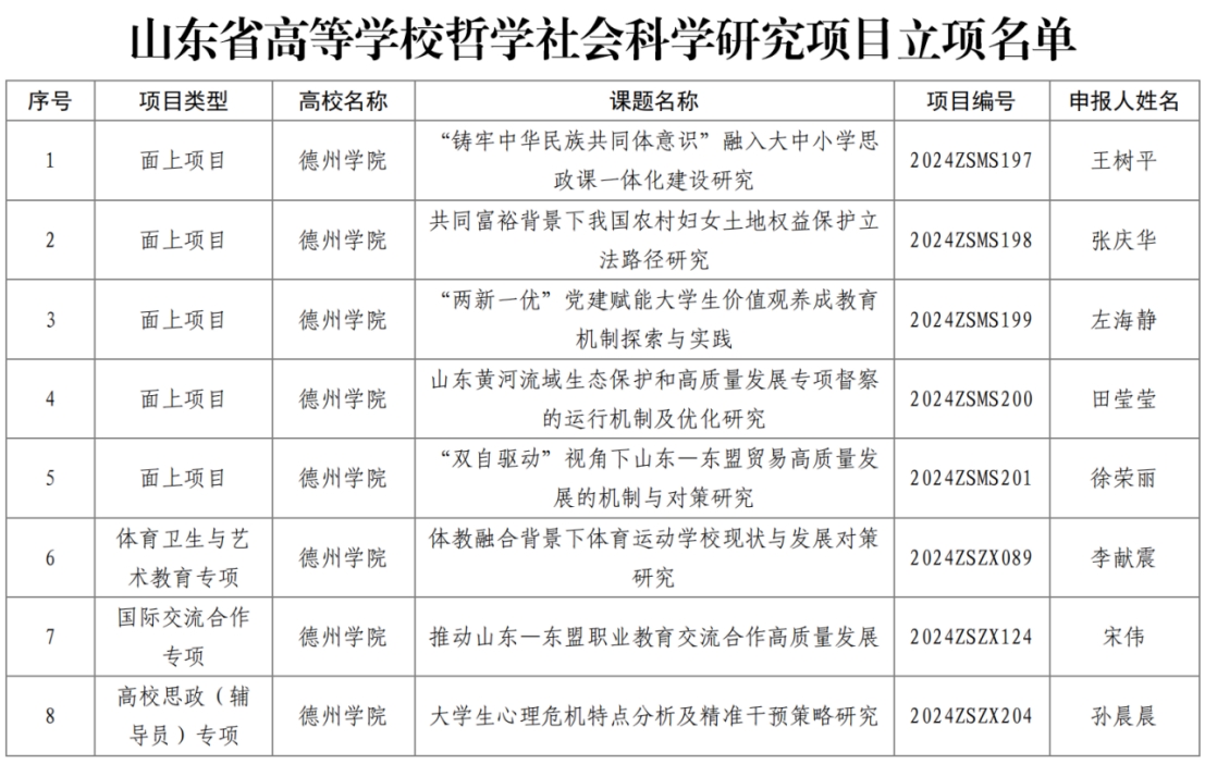 近日,山东省教育厅公布了山东省高等学校哲学社会科学研究项目立项名单,我校8项项目予以立项,其中面上项目5项,体育卫生与艺术教育专项、国际交流合作专项、高校思政(辅导员)专项各1项。